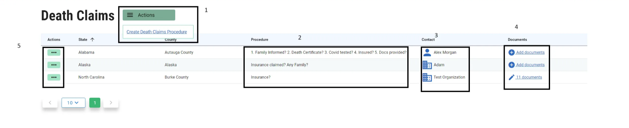 This page allows you to create Death Claims Procedures for a specific county in any state. A number of documents can then be added to each death claim procedure.