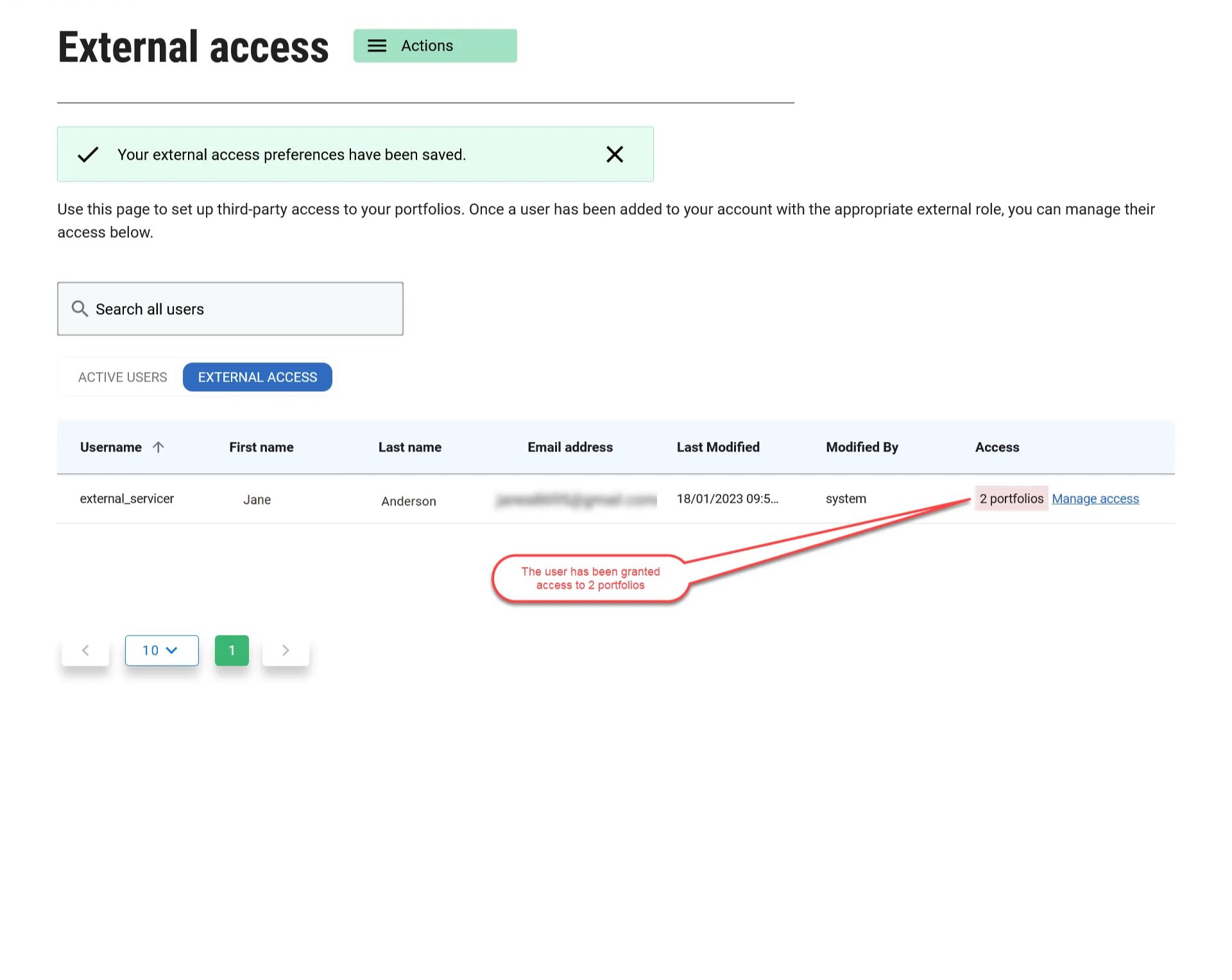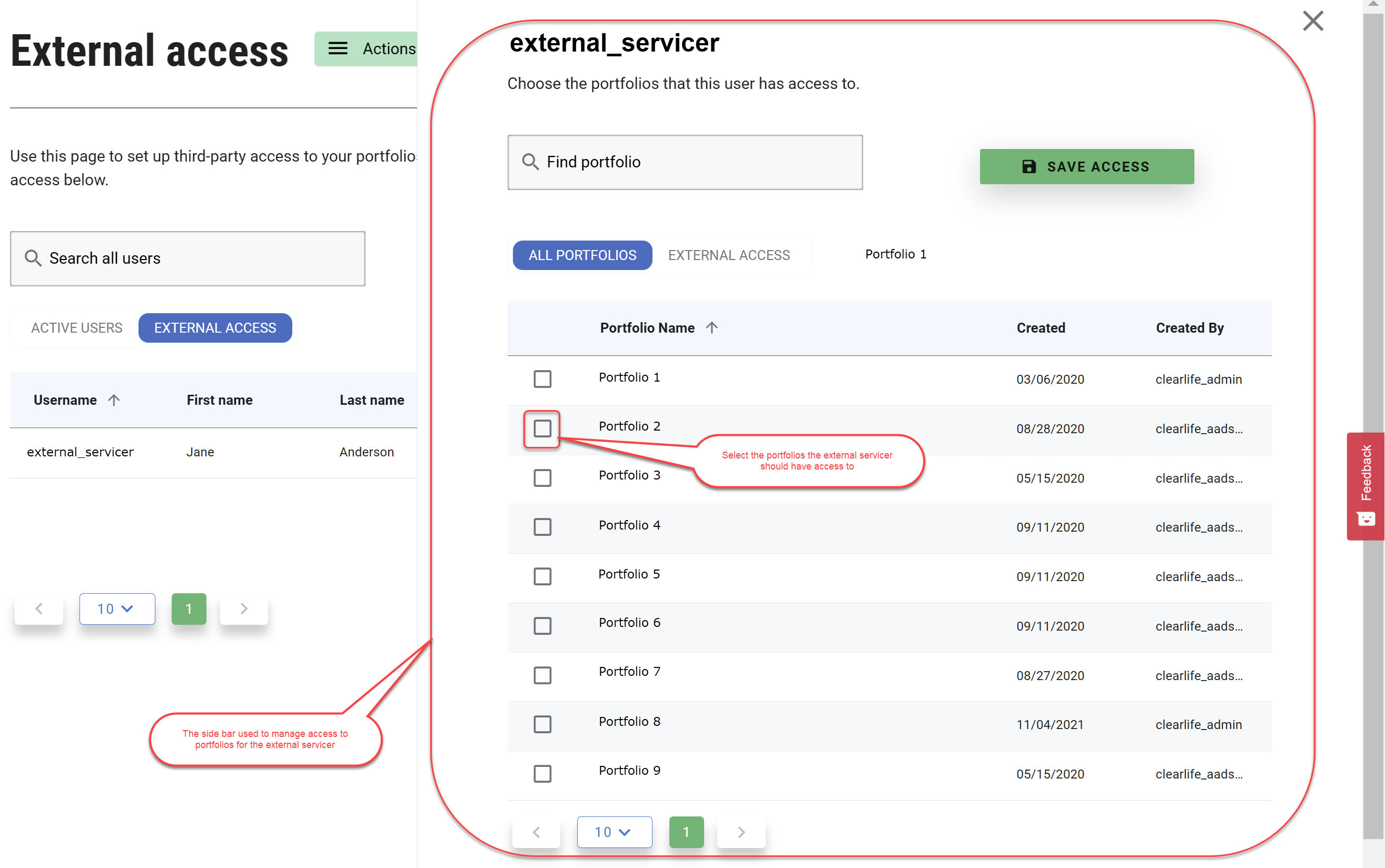 Simply select the portfolios the external servicing users should have access to and click the Save Access button.