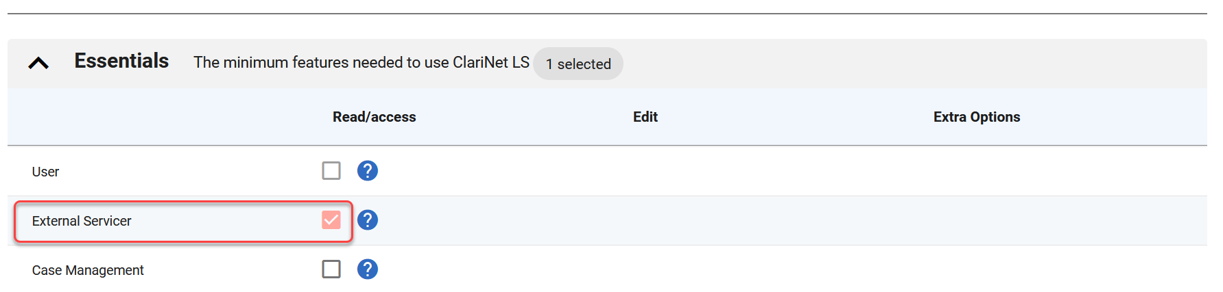 When specifying the permissions, uncheck the User role and check External Servicer