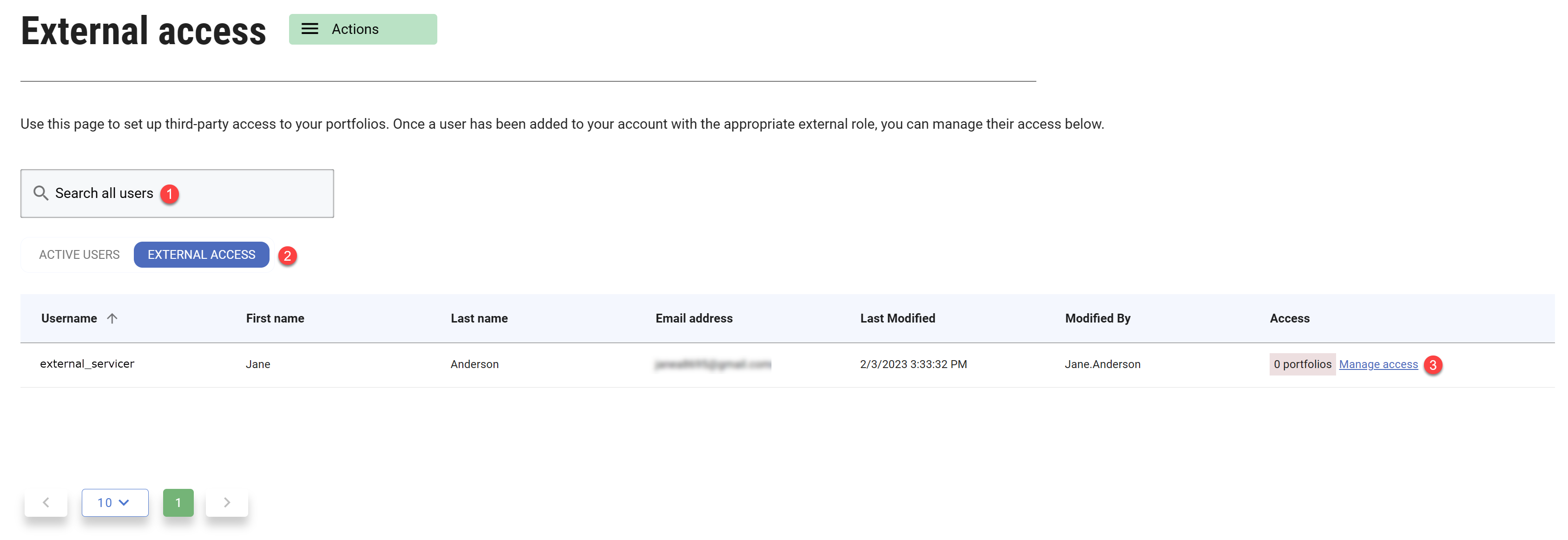 2. A filter to show all users or just external servicing users (users with the External Servicer role)