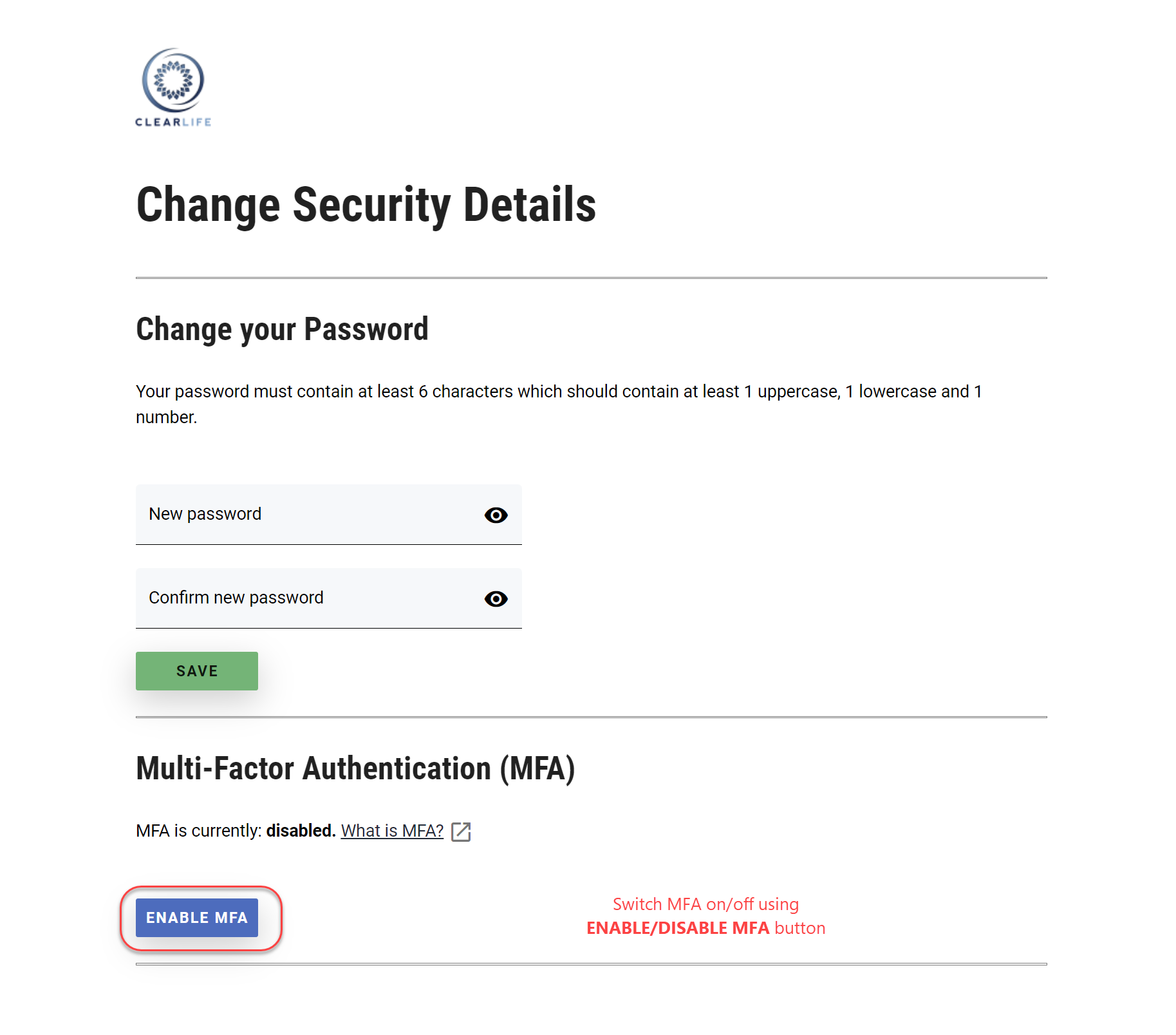Assuming company-wide MFA has not been enabled, a user can switch on/off MFA for their own account using the ENABLE/DISABLE MFA button.