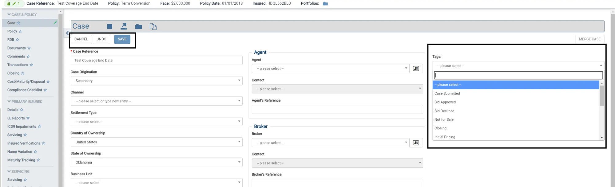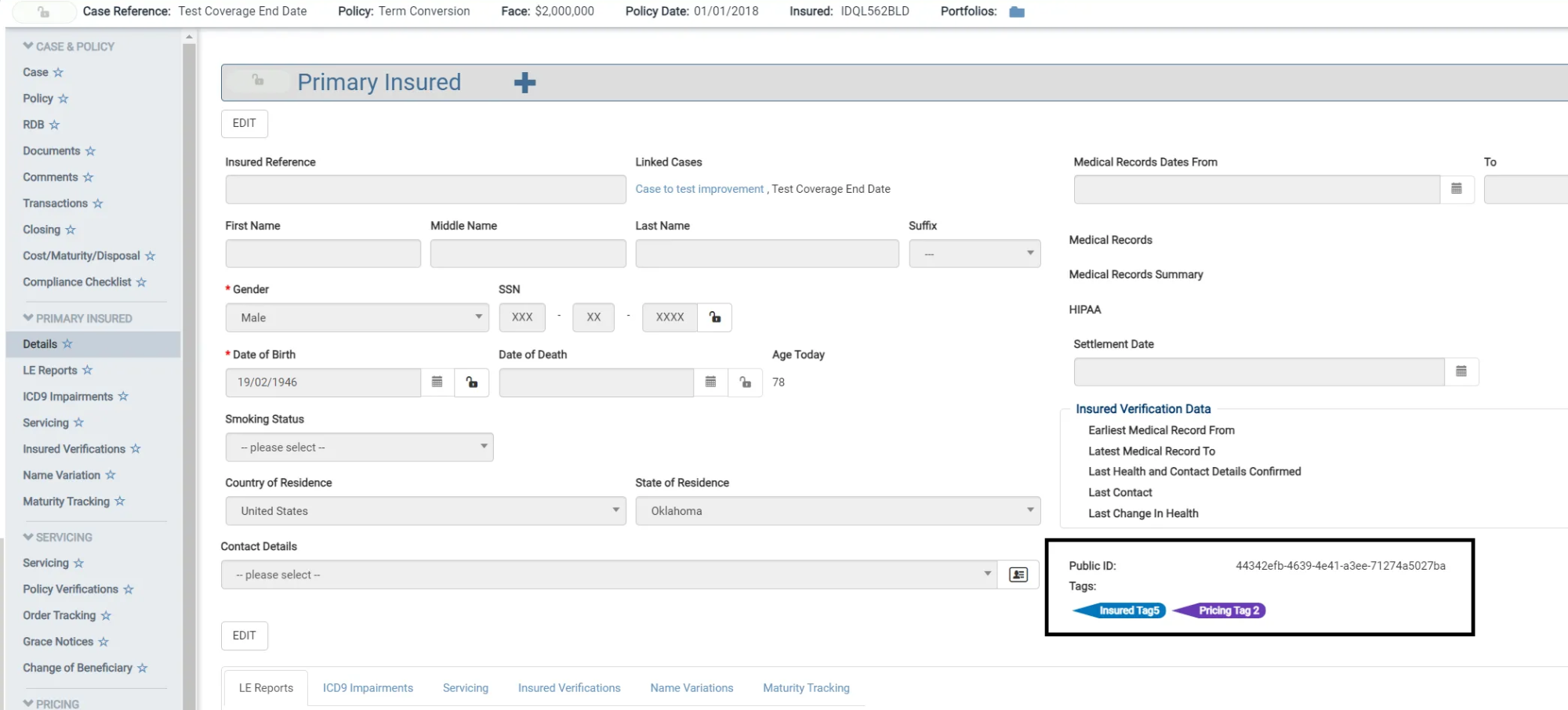- Expand Case and select Case Tag or expand Primary/Secondary Insured and select Insured Tag