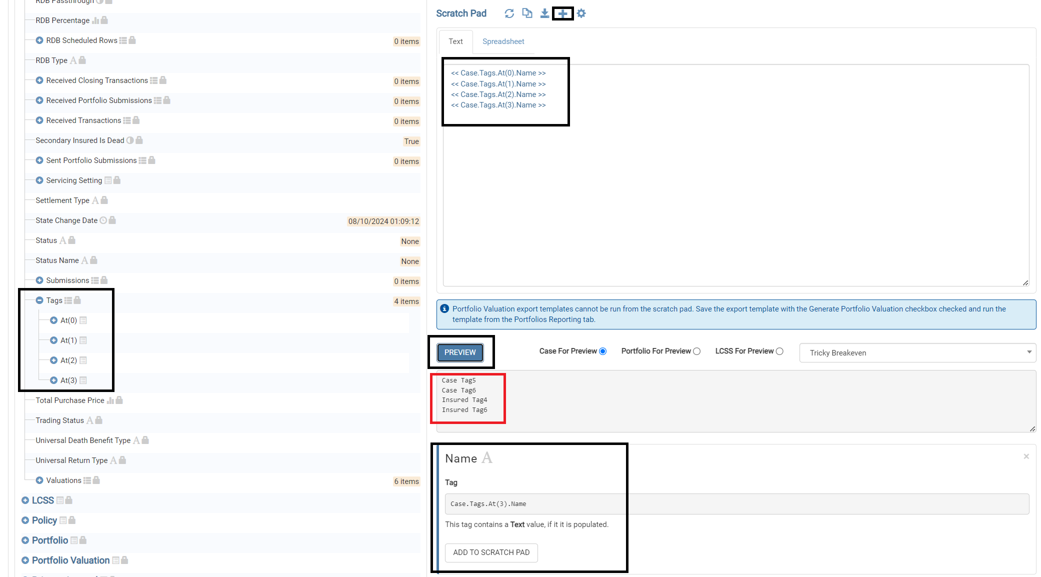 For Export Template report creation, you can simply add all the required tags to the scratchpad and create a new template out of it. This template can be run against a case or portfolio on an Advanced search page or on the portfolios page.