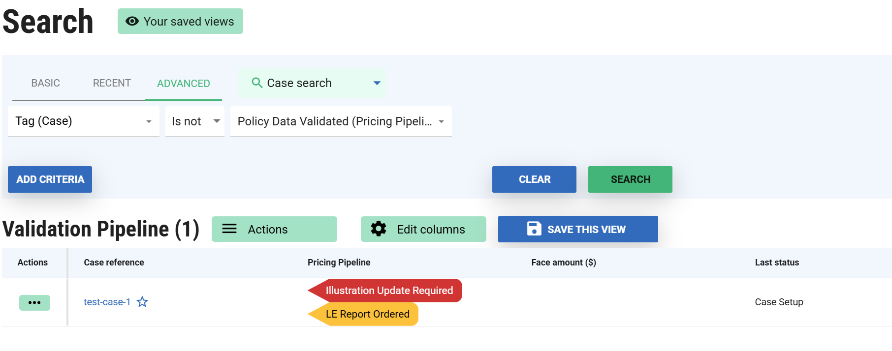 In this example workflow, a new case is onboarded without the “Policy Data Validated” tag. This is immediately visible in the “Validation Pipeline” view we created. User A has this list on their homepage and starts work on validating the case/policy/insured data. As part of this checklist, the user notes that the illustration is out of date so adds the “Illustration Update Required” tag. All other data is fine so the user adds a comment to the case and the “Policy Data Validated” tag is added. Another user, using a saved view for cases tagged with “Illustration Update Required” creates a new Illustration order and removes the “Illustration Update Required” tag and adds “Illustration Ordered” tag.