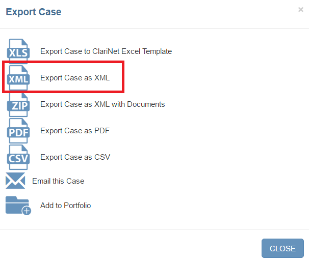 - Confirm the format for export by selecting Export Case as XML.