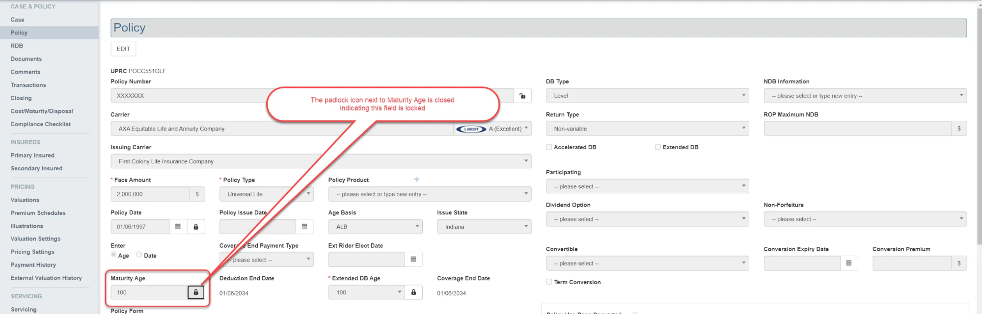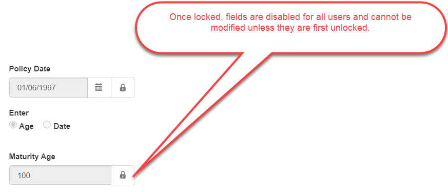 In the example below, the Maturity Age field has been locked; this is indicated by the closed padlock icon next to the field. Do this by simply clicking on the lock button next to the fields when the page is in view mode.