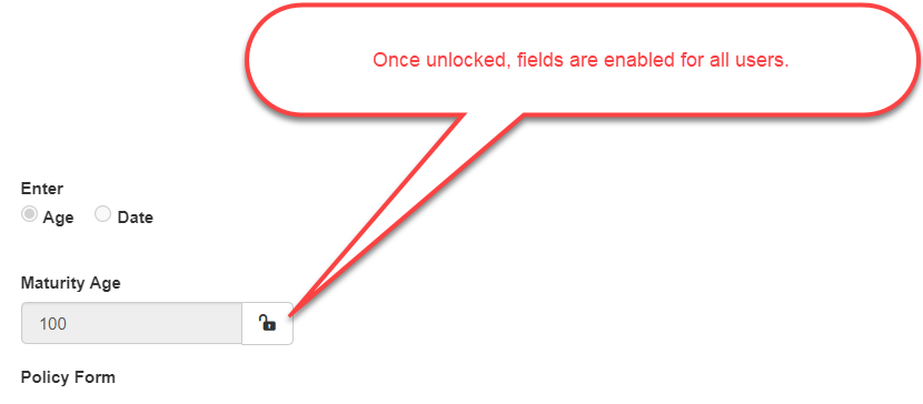 In the next example, the Maturity Age field has been unlocked by clicking on the locked icon next to the field when the page is in view mode. Once unlocked, the field will be available for editing for all users.