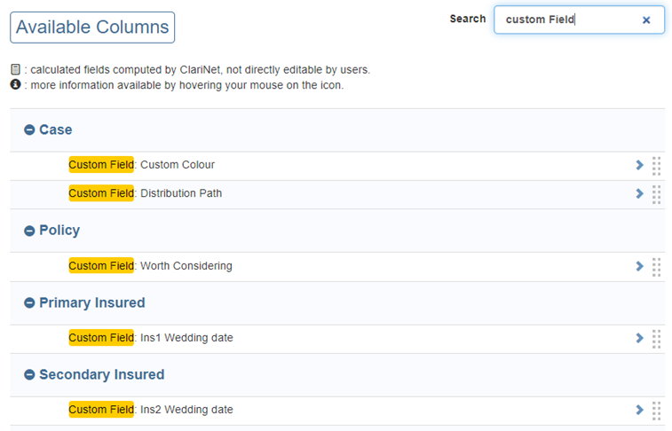 Custom fields are also included in Custom Reports. They are available in each of the relevant entity section (Case, Policy, Primary/Secondary Insured), and are prefixed with the words “Custom Field:”.