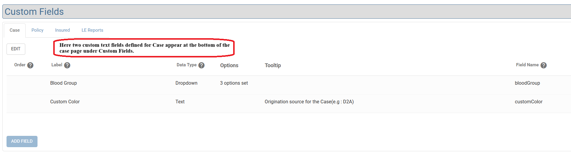 Here, two TEXT custom fields are defined for Case and these will appear at the bottom of the Case page under the Custom Fields heading.