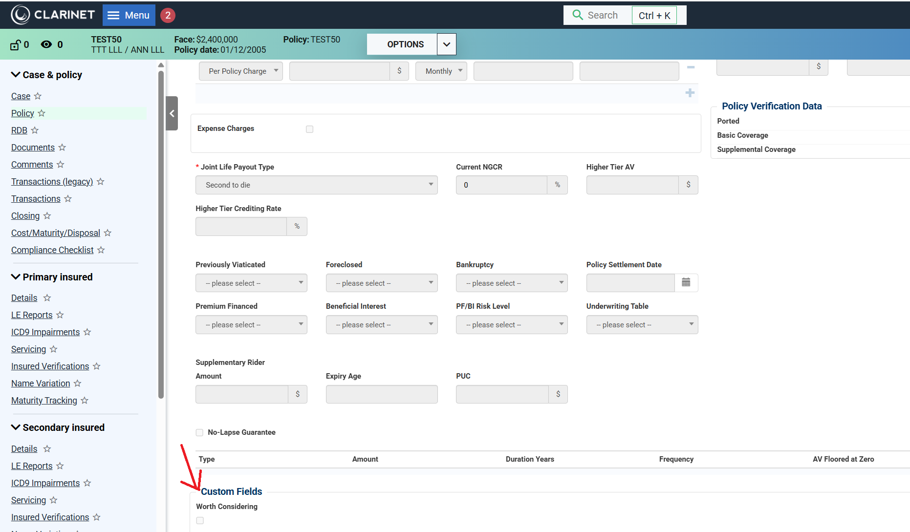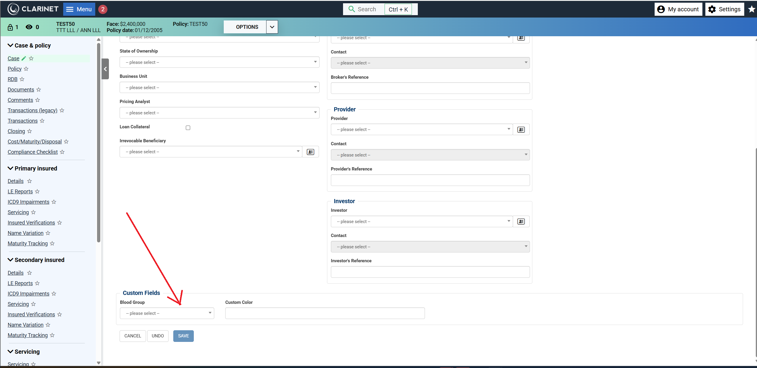 Custom fields appear at the bottom of the Case, Policy, or Primary/Secondary Insured page. You can edit them the same way as any other standard field on the page. Click on the links below to see examples.