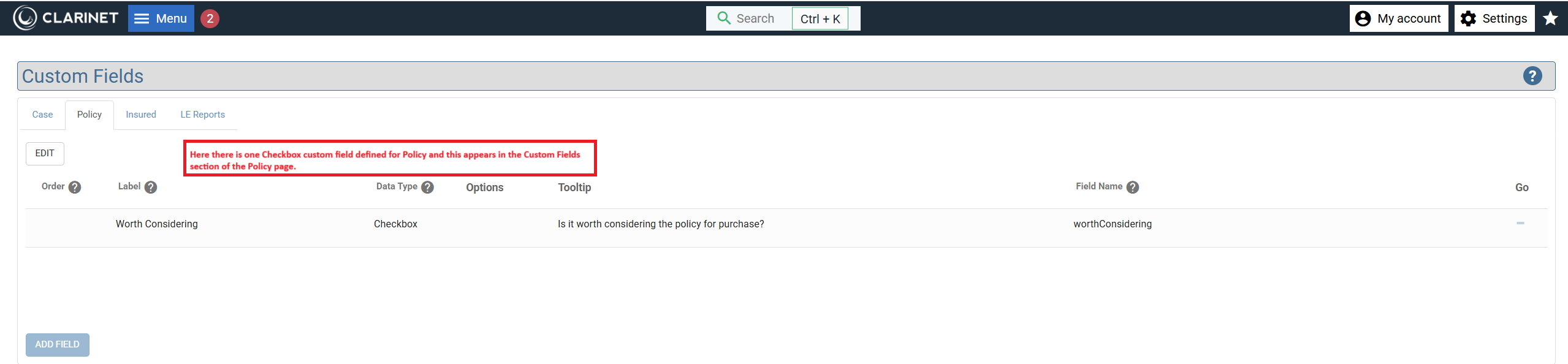 In this example, one CHECKBOX custom field is defined for Policy and this appears at the bottom of the Policy page under the Custom Fields heading.