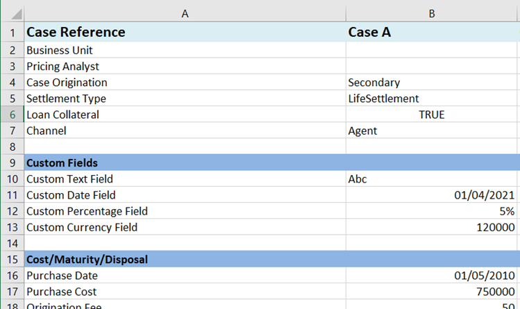 Please select Help / Templates and download the latest available CCSExcelTemplatev123.xlsx file for an example. The Custom Fields section can be added under each relevant entity (Case, Policy, Primary/Secondary Insured). This example shows four Custom Fields added to the Case, but you can add a similar block under the Policy or Insured headers: