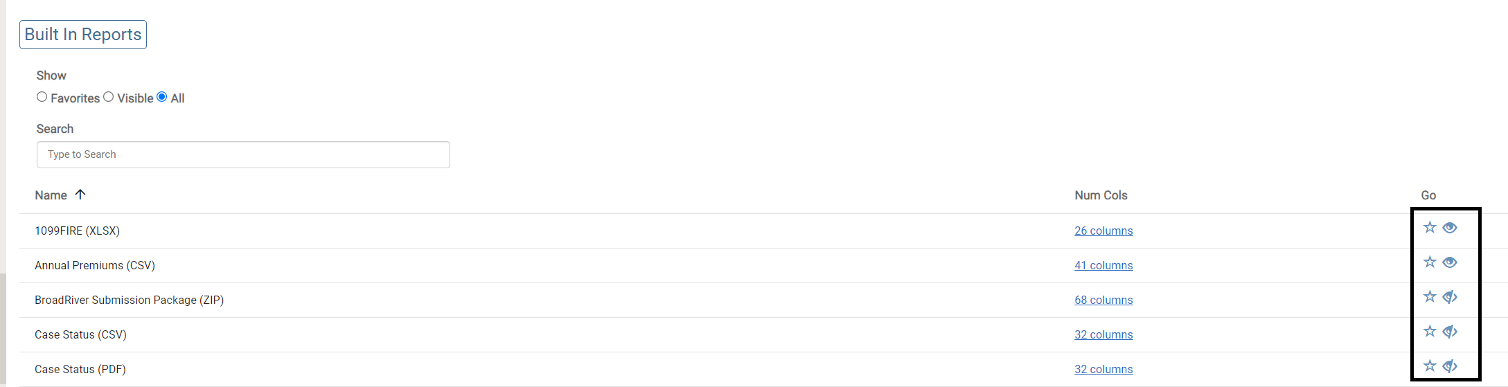 The eye icon under the GO column allows you to hide a built-in Report. Hidden reports will be hidden from the reports list and the reporting modal.