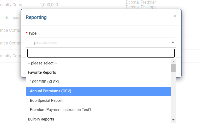 | Annual Premium (CSV) | The Annual Premium is the future expected Premium Schedules for each case in a portfolio, from Year 1 (Policy Date) to Coverage End Date. It contains 41 columns as listed above under The list of Built-in Reports are : Annual Premiums (CSV). | N/A |