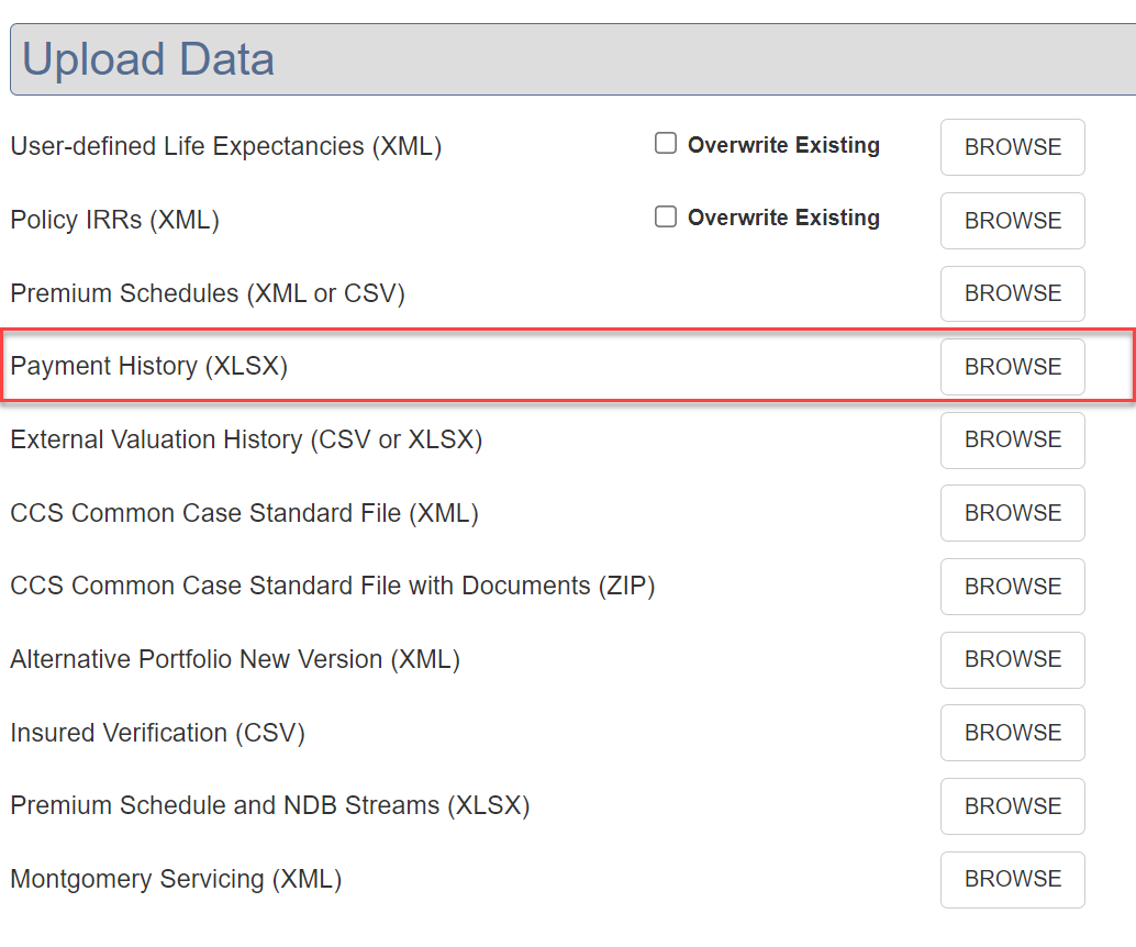 To use this option go to the Cases menu and select Upload Data. From the Upload Data screen you can browse and import Payment History.