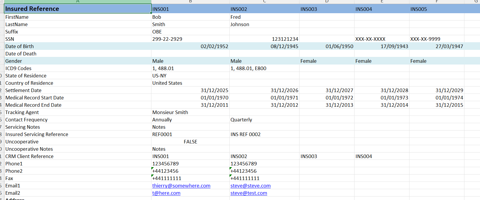 The Insured excel upload template can be found at https://www.clarinetlive.com/user/templates. The insureds are arranged in columns, with the heading of each the Insured Reference. The Insured reference must be supplied if you are matching to existing insureds using Insured Reference, and it must be unique within the context of the excel sheet.