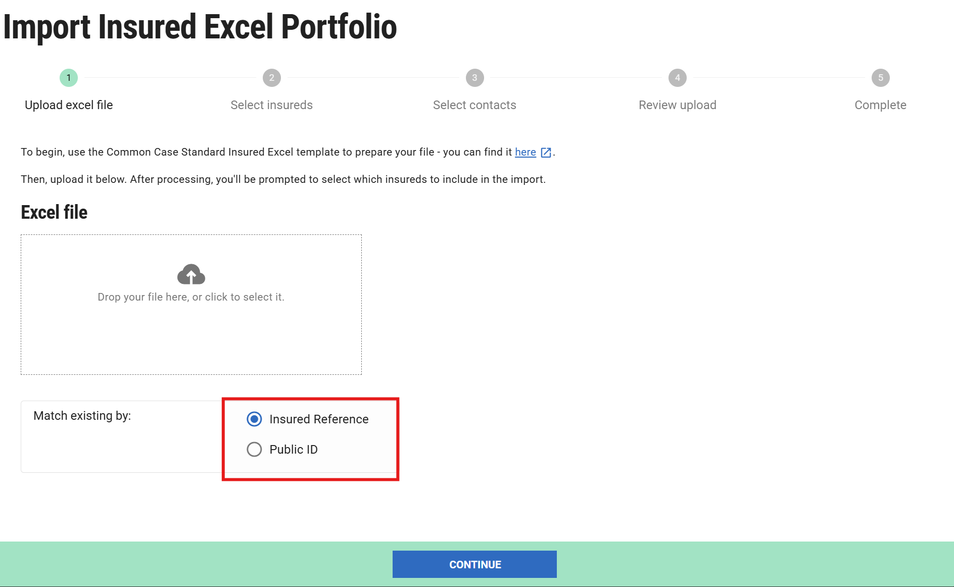 During the import process, you’ll be asked how you want to match your spreadsheet data to existing Insureds in ClariNet. You can choose to match by Insured Reference or by Public ID—whichever works best for your data.