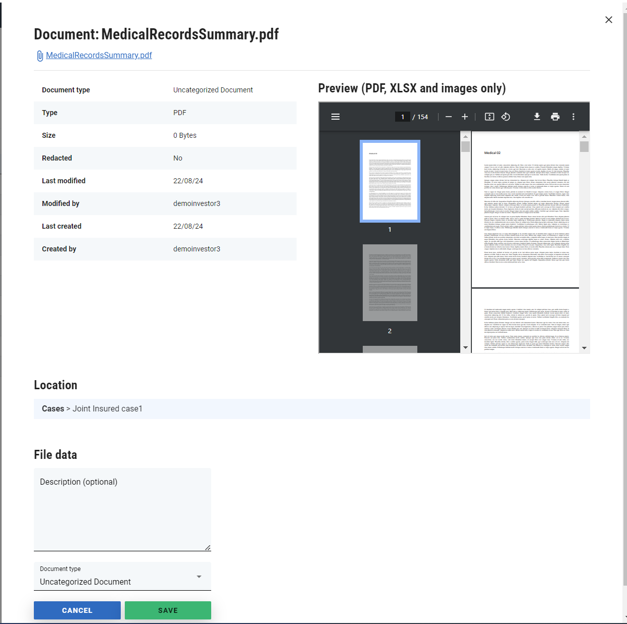 - Choose the upload location from the box on the right, which can be portfolios, cases or Insureds.