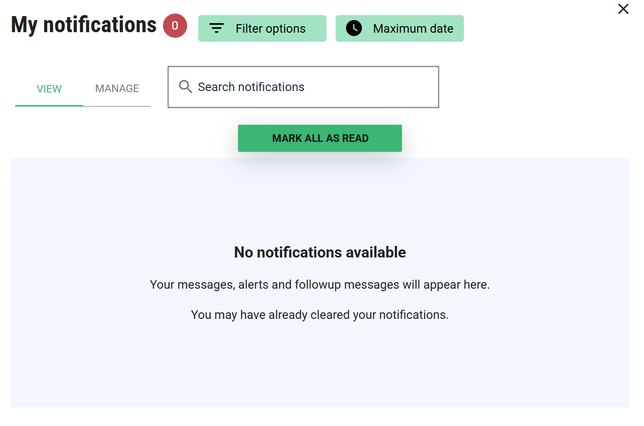 If, for any received transaction, a Bid has been placed, a red, numbered alerts pin appears to the right of the main menu as well as in the My account menu. Clicking the pin opens up an Alerts page with more detail.