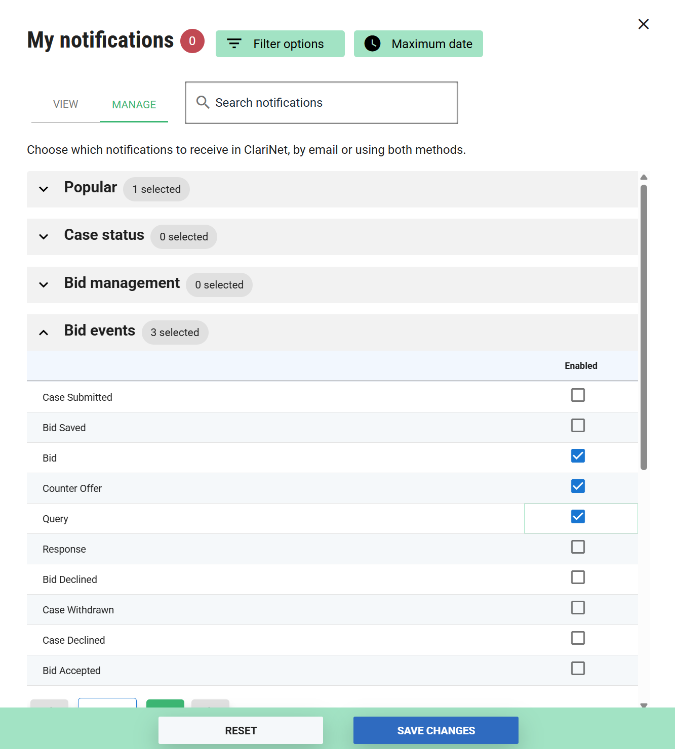 Using the My notifications option under the My account we recommend you set up alerts for various transaction events. For example, you can set up an alert for events such as Bid, Counter Offer and Query. Use the check boxes in the Bid events section to select the events where you want to set an alert and then click SAVE at the bottom of the page.