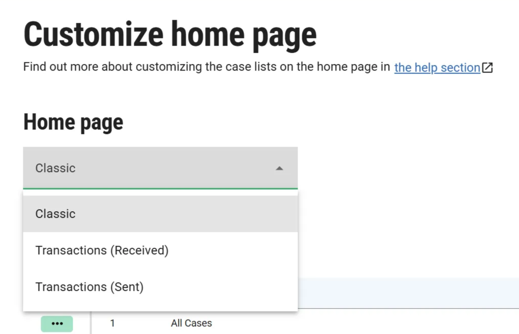 In the Home Page section you can customize your Home page to display either Classic (Case List) or Transactions (Received).