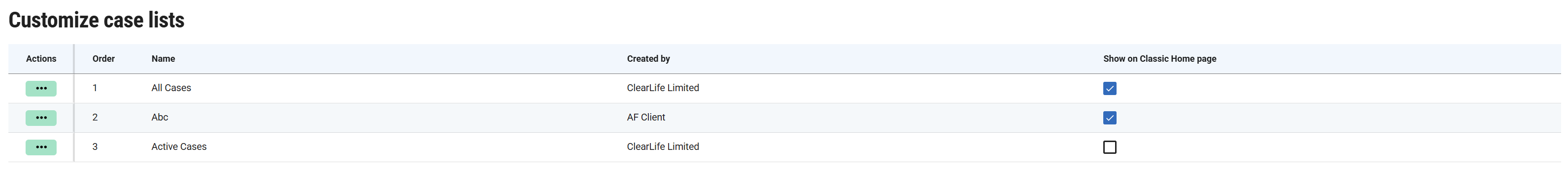 In the Customize home page section in the My account menu, you can define which Case Lists are displayed on your Home page by checking the Show on Classic Home Page check box.
