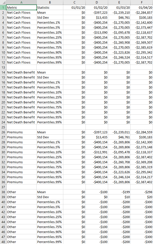 The results are split into 4 sections with the total cashflows first and then the subsets below. The flows marked “Other” are any flows that don’t fit into Death Benefit or Premiums; this includes Fees, loan payments and cash withdrawals.