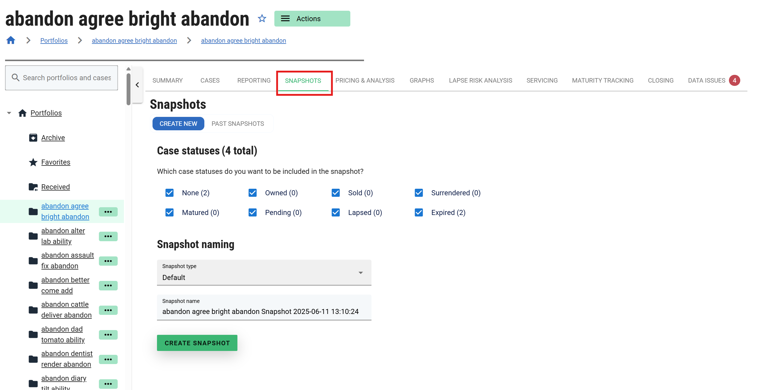 The Portfolio snapshot feature allows you to capture the state of a Portfolio of Cases at a particular moment in time. This can be useful, for example, so that you can regularly capture the state at the end of the month or aligned with significant reporting dates, to allow you to view Policy and other valuation relevant attributes from the Case as they were at a particular point in time.