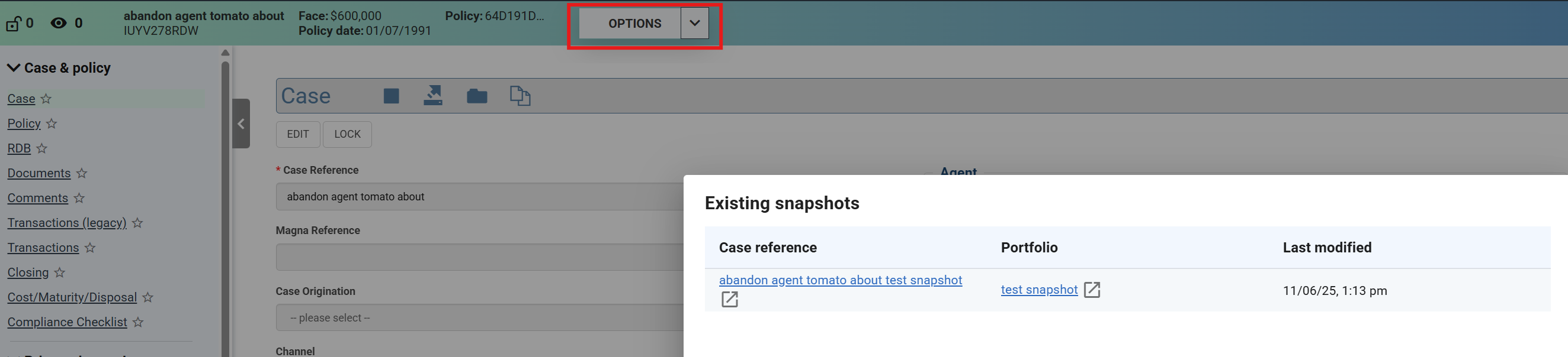 You can view snapshots of a particular Case by accessing the Snapshots sub menu via the Options button of the Case navigation bar.
