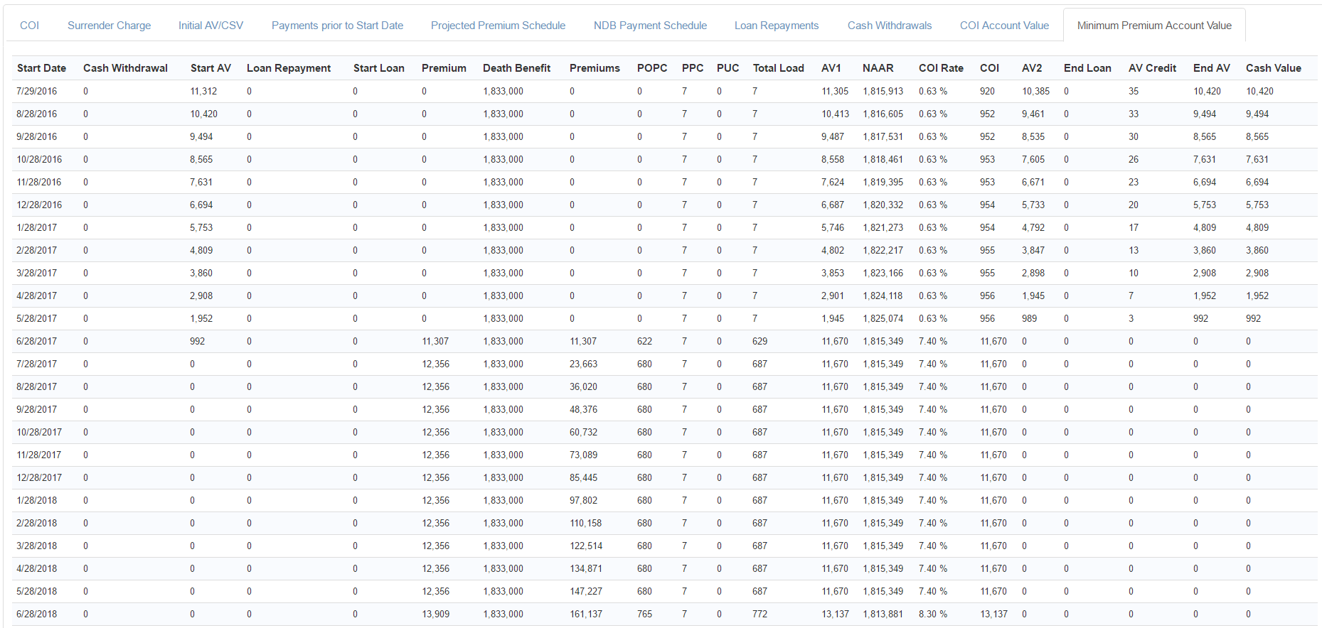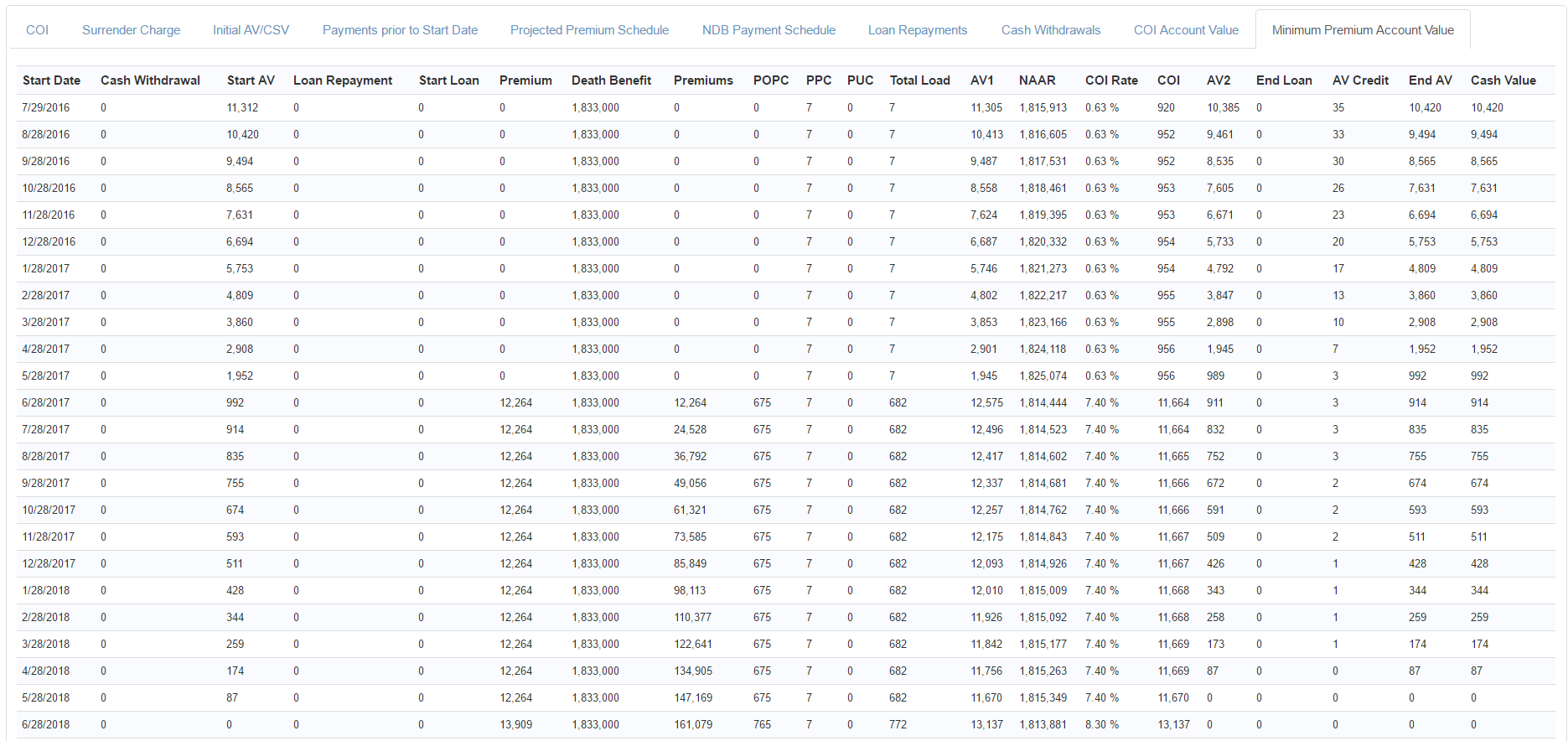 In this example, the Policy Date is 28-June. You can see that the modal monthly premium is set to $12,256 at the start of the 2018 policy year such that AV/CSV is zero at the end of that policy year. This leads to a small AV/CSV which declines to zero over the year.