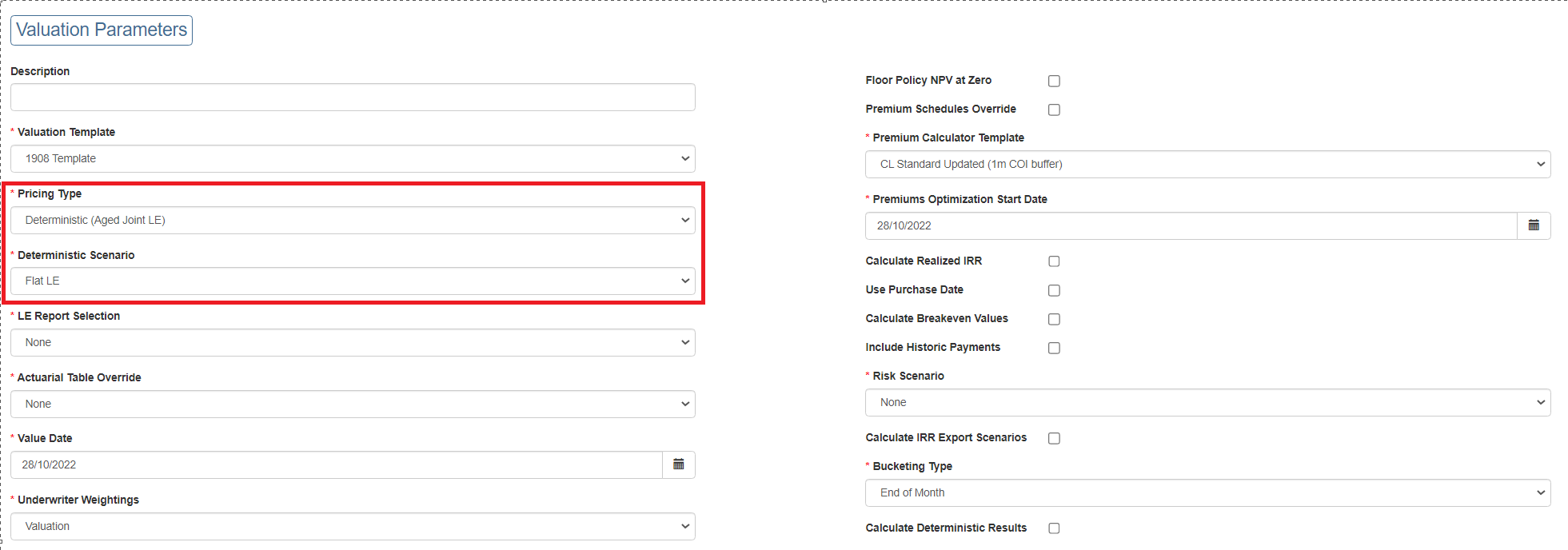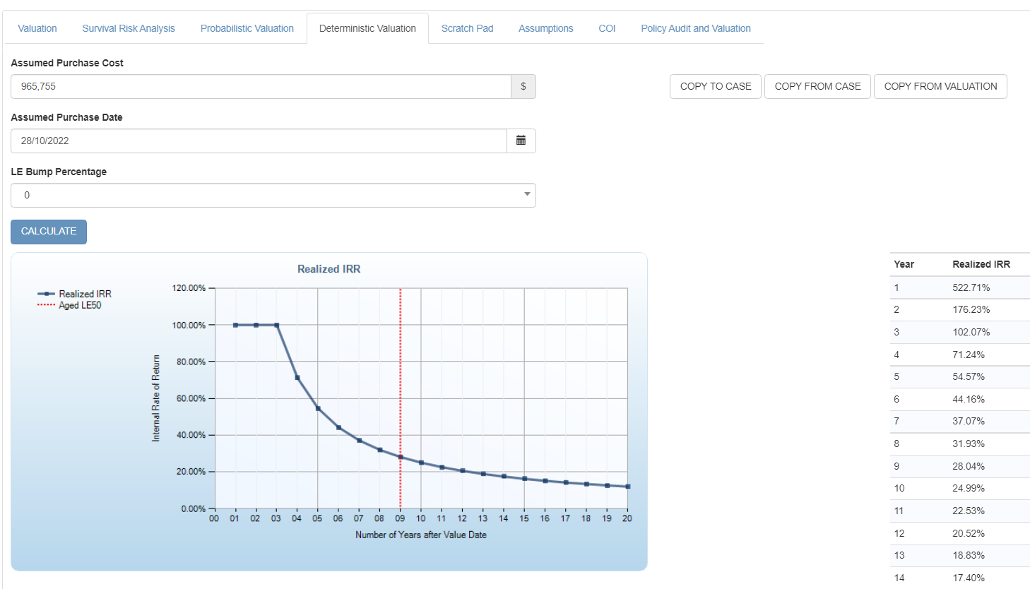 • Deterministic (Individual LE): a date of death is calculated based on the blended underwriting date plus the blended LE50. For a joint life policy, either the earlier or later of these dates is used depending on the joint life payout type. Note that this type of valuation implies “straight aging” and will therefore lead to high valuations;