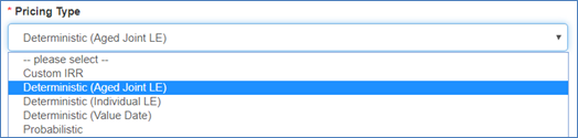 • Deterministic (Aged Joint LE): an aged LE50 is calculated on Value Date (joint if this is a joint life policy) and the date of death is calculated based on Value Date + Aged LE50;