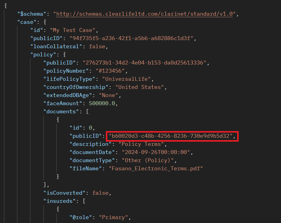 The second is a policy document that we’re associating with a specific Policy entity that we’re providing the public identifier of, and indicating that we’ve redacted it. Note that it’s up to you to perform the redaction of the document, flagging a document as redacted will just make the UI indicate that it’s a redacted document, and reduce or change the access permissions required to view it.