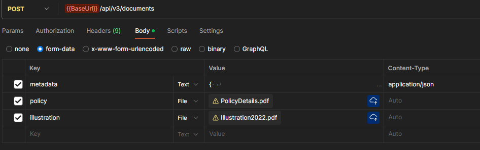 }This describes a multi-part upload containing two documents. The first document type is indicative, meaning we’re not associating it directly with an Illustration entity, but we’re associating it with a ClearLifeCase to which the document is relevant.