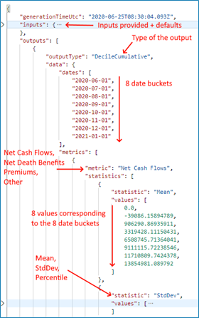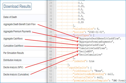 OutputTypes: An array of output types you want to receive in the output. One or more of the following values: DecileCumulative, DecileNPV, AggregateCashFlows, CumulativeCashFlows, AggregateDeathBenefitCashFlow, AggregatePremiumPayments. String array, required