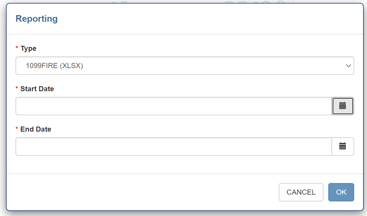 The 1099FIRE Report is listed in the Reports pop-up accessed when clicking the Reports button It can be run either on Search results or Portfolios, and takes two parameters, Start Date and End Date (referring to the Purchase Date or the Closing Transaction’s Completed Date, see below).