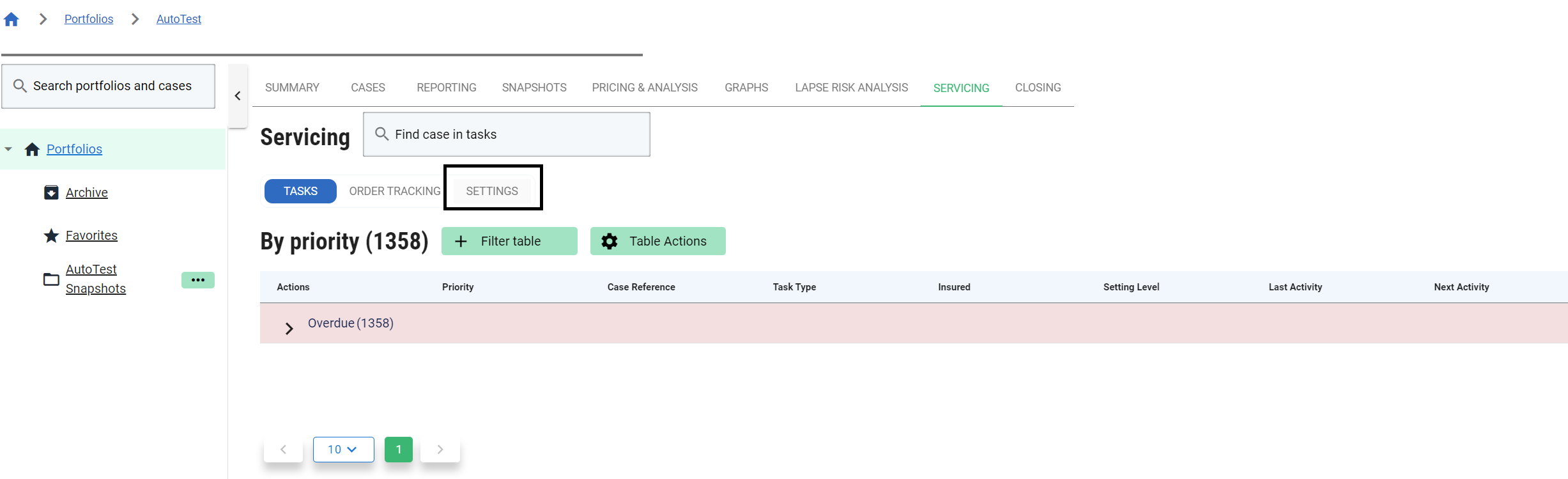 This page allows you to view and take action on Servicing Tasks for Cases contained within each Portfolio. It is accessed from the Portfolio list page.